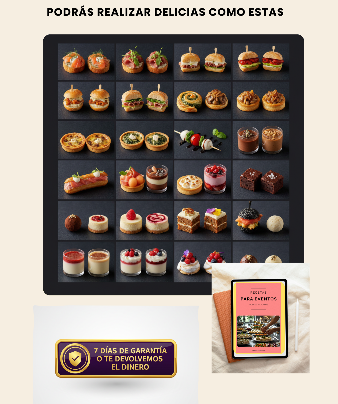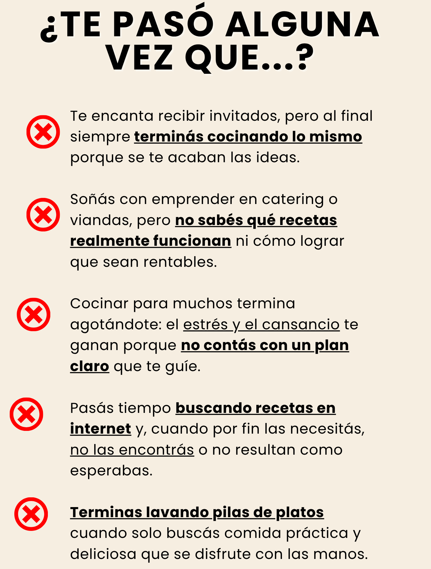 Incluye el libro principal con estrategias, recetas y técnicas para cocinar para grupos grandes de forma rentable y organizada, más 5 bonos exclusivos que complementan y potencian tu negocio gastronómico.
